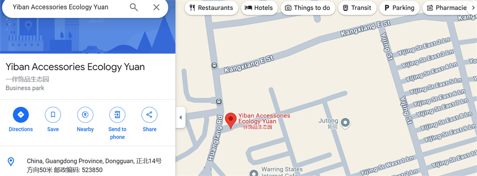 Factory Address:No. 18, Huanglang Road, Dongguan City, Guangdong Province, China (Building 16, Yiban Accessories Ecology Yuan) Postal Code: 523850